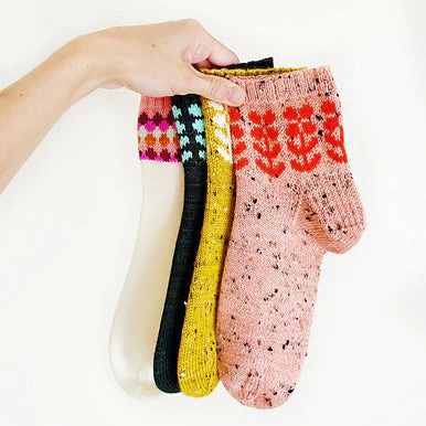 Learn to knit colorwork socks! In this class we’ll work on tension, techniques for catching floats, color changing, all while working with small circumference. Colorwork socks are so fun, but can be a little tricky. This class will guide you through and you’ll leave feeling confident with small circumference colorwork.